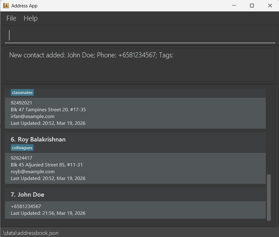 add n/John Doe p/98765432 e/johnd@example.com a/John street, block 123, #01-01add n/Betsy Crowe t/friend e/betsycrowe@example.com a/Newgate Prison p/1234567 t/criminaladd n/Alex Tan p/91234567add n/Jane Smith e/jane@example.com lc/22/02/2026After a successful add command, the contact list will be reset to display every contact in the default sort order, then if there are similar contacts in the list, the contact list will be displayed to display the similar contacts.