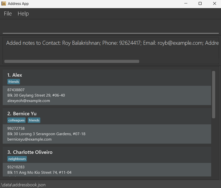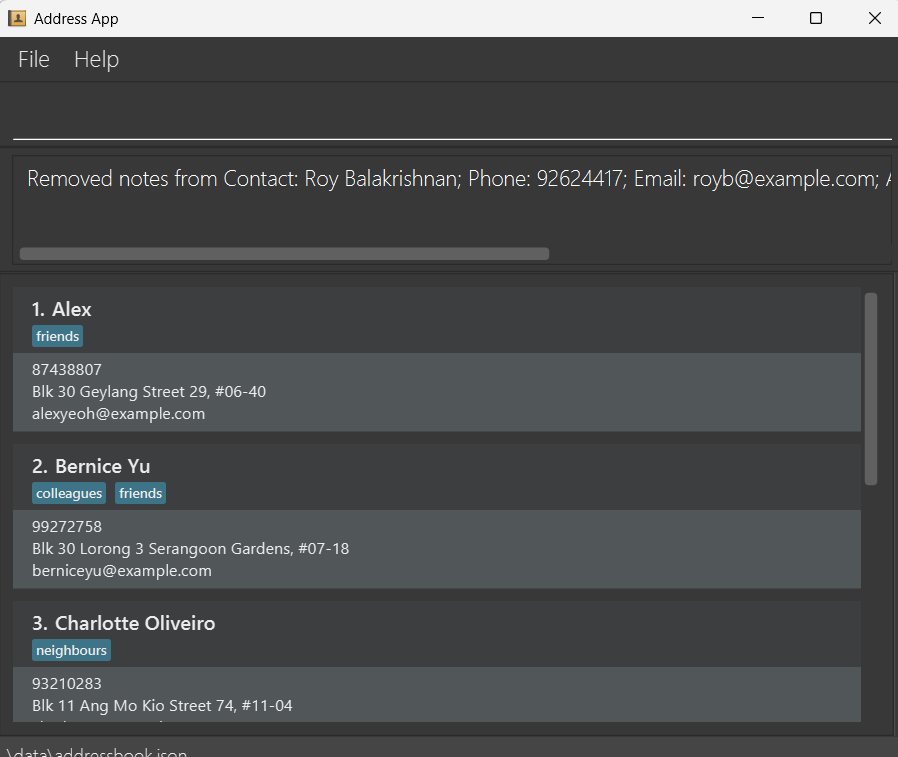 note 1 el/1 Updated note text. replaces the 1st note of the 1st contact.note 2 el/3 Follow up call on/15 Apr replaces the 3rd note for the 2nd contact and sets a reminder.Remove a specific note: