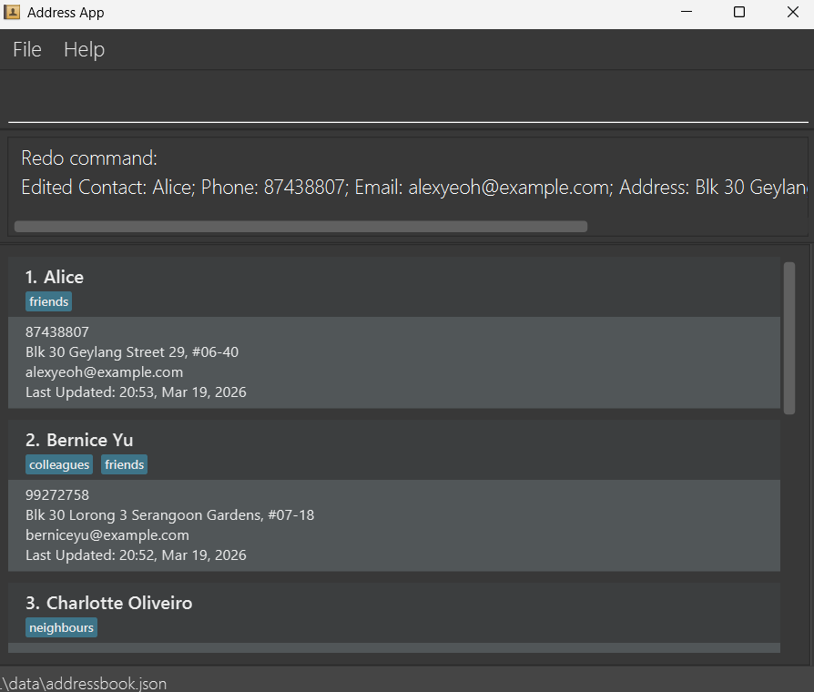 delete 1 then undo then redo re-deletes the 1st contact.edit 1 n/New Name then undo then redo re-applies the name change.