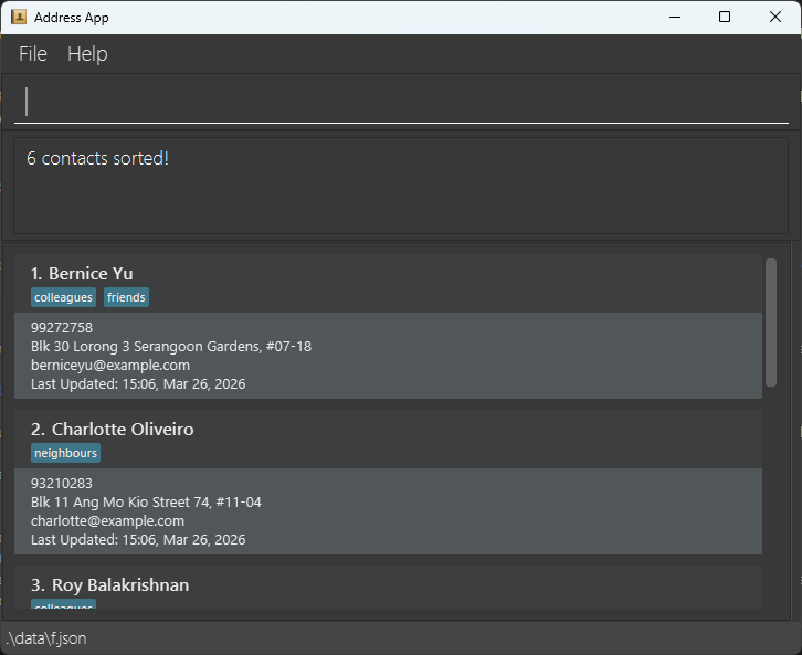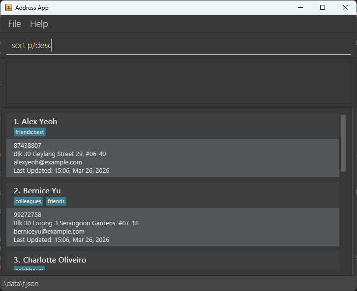 n/ — sort by name, p/ — sort by phone, e/ — sort by email, a/ — sort by address, lu/ — sort by last updated, lc/ — sort by last contacted.t/TAG_NAME — contacts with the ranked tag TAG_NAME are displayed at the top.sort commands can stack.Examples: